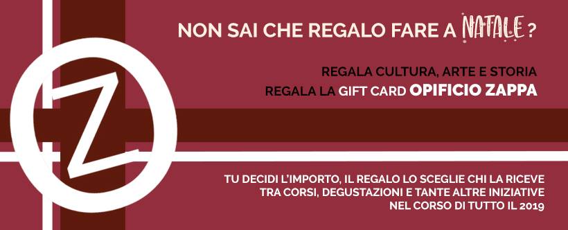 E da quest’anno potrete scegliere di regalare anche un pò di Cultura, Arte e Storia con la Gift Card di Opificio Zappa che ti permette di scegliere l’importo che vuoi regalare per poter far scegliere a chi vorrai una tra le tante iniziative in programma per l’anno 2019, tra corsi, eventi, degustazioni e tante altre iniziative targate OZ.